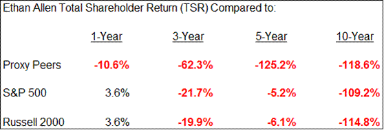 It is also unfortunate that, while you have led Ethan Allen for close to 30 years and have built a unique business of substance, shareholders have suffered extended and material underperformance due in large part to what we believe to be the Company’s sub-optimal fiscal policies and inefficient allocation of shareholder capital over the last several years. Indeed, Ethan Allen serves as an abject example of the ill effects that can befall shareholders invested in a company that does not earn an appropriate return on its capital. The following chart shows in stark detail the underperformance that shareholders have been subjected to: