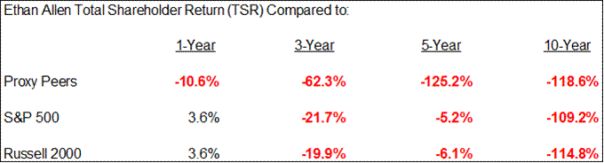 Shareholders of Ethan Allen have suffered years of underperformance versus the Company’s own selected proxy peers under the leadership of Chairman and CEO Farooq Kathwari and its Board of Directors, as the following chart illustrates: