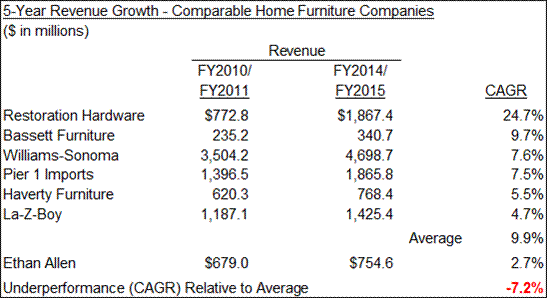 In our view, this stale and outdated way of thinking does not simply relate to the Company’s financial and real estate policies, but has negatively impacted Ethan Allen’s operational performance as measured by the key retailing metric of revenue growth. Notably, the Company’s sales have shown anemic growth over the last five years, while other competitors have witnessed greater sales growth and market share gains at the expense of retailers like Ethan Allen. Furthermore, Ethan Allen generates very little online revenue, currently estimated at between 2% to 5% of sales based on various analyst reports. While the “Ethan Allen” brand is truly iconic in its connotation of quality furniture, we believe this brand equity has been squandered by management as Ethan Allen has continued to struggle to generate sales in recent years.