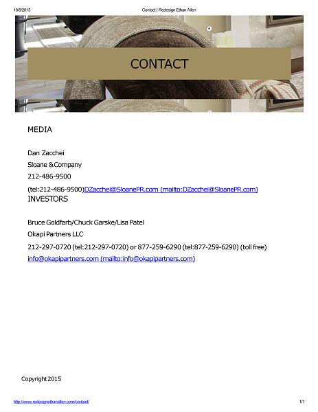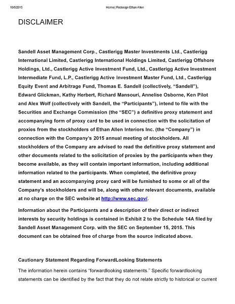 10/8/2015 Home | Redesign Ethan Allen DISCLAIMER Sandell Asset Management Corp., Castlerigg Master Investments Ltd., Castlerigg International Limited, Castlerigg International Holdings Limited, Castlerigg Offshore Holdings, Ltd., Castlerigg Active Investment Fund, Ltd., Castlerigg Active Investment Intermediate Fund, L.P., Castlerigg Active Investment Master Fund, Ltd., Castlerigg Equity Event and Arbitrage Fund, Thomas E. Sandell (collectively, “Sandell”), Edward Glickman, Kathy Herbert, Richard Mansouri, Annelise Osborne, Ken Pilot and Alex Wolf (collectively with Sandell, the “Participants”), intend to file with the Securities and Exchange Commission (the “SEC”) a definitive proxy statement and accompanying form of proxy card to be used in connection with the solicitation of proxies from the stockholders of Ethan Allen Interiors Inc. (the “Company”) in connection with the Company’s 2015 annual meeting of stockholders. All stockholders of the Company are advised to read the definitive proxy statement and other documents related to the solicitation of proxies by the participants when they become available, as they will contain important information, including additional information related to the participants. When completed, the definitive proxy statement and an accompanying proxy card will be furnished to some or all of the Company’s stockholders and will be, along with other relevant documents, available at no charge on the SEC website at http ://www.sec.gov/ . Information about the Participants and a description of their direct or indirect interests by security holdings is contained in Exhibit 2 to the Schedule 14A filed by Sandell Asset Management Corp. with the SEC on September 15, 2015. This document can be obtained free of charge from the source indicated above. Cautionary Statement Regarding Forward Looking Statements The information herein contains “forward looking statements.” Specific forward looking statements can be identified by the fact that they do not relate strictly to historical or current