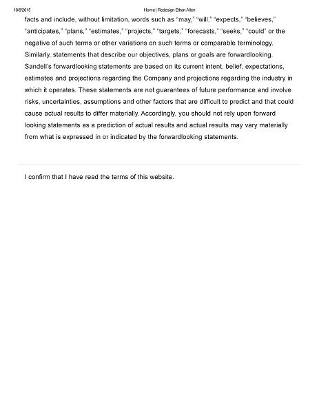 I confirm that I have read the terms of this website. 10/8/2015 Home | Redesign Ethan Allen facts and include, without limitation, words such as “may,” “will,” “expects,” “believes,” “anticipates,” “plans,” “estimates,” “projects,” “targets,” “forecasts,” “seeks,” “could” or the negative of such terms or other variations on such terms or comparable terminology. Similarly, statements that describe our objectives, plans or goals are forward looking. Sandell’s forward looking statements are based on its current intent, belief, expectations, estimates and projections regarding the Company and projections regarding the industry in which it operates. These statements are not guarantees of future performance and involve risks, uncertainties, assumptions and other factors that are difficult to predict and that could cause actual results to differ materially. Accordingly, you should not rely upon forward looking statements as a prediction of actual results and actual results may vary materially from what is expressed in or indicated by the forward looking statements.