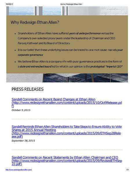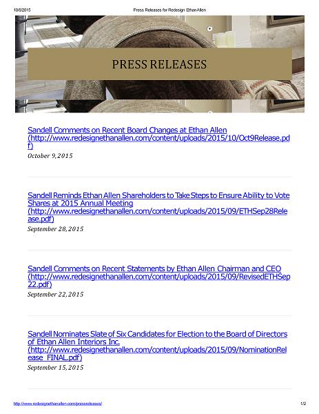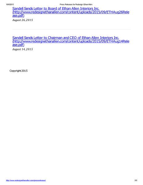 10/8/2015 Press Releases for Redesign Ethan Allen Sandell Sends Letter to Board of Ethan Allen Interiors Inc. ( h tt p : / / ww w . r e d e s i g n e t h a n a ll e n . c o m / c o n t e n t / u p l o a d s / 2015 / 09 / E T H A u g 26 R e l e ase.pdf) August 26, 2015 Sandell Sends Letter to Chairman and CEO of Ethan Allen Interiors Inc. ( h tt p : / / ww w . r e d e s i g n e t h a n a ll e n . c o m / c o n t e n t / u p l o a d s / 2015 / 09 / E T H A u g 14 R e l e ase.pdf) August 14, 2015 Copyright 2015 http://ww w.redesignethanallen.com/press releases/ 2 / 2