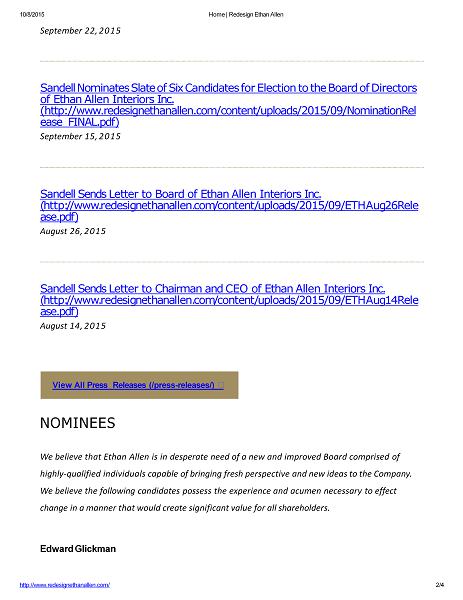 10/8/2015 Home | Redesign Ethan Allen September 22, 2015 Sandell Nominates Slate of Six Candidates for Election to the Board of Directors of Ethan Allen Interiors Inc. (http://www.redesignethanallen.com/content/uploads/2015/09/NominationRel ease_FINAL.pdf) September 15, 2015 Sandell Sends Letter to Board of Ethan Allen Interiors Inc. ( h tt p : / / ww w . r e d e s i g n e t h a n a ll e n . c o m / c o n t e n t / u p l o a d s / 2015 / 09 / E T H A u g 26 R e l e ase.pdf) August 26, 2015 Sandell Sends Letter to Chairman and CEO of Ethan Allen Interiors Inc. ( h tt p : / / ww w . r e d e s i g n e t h a n a ll e n . c o m / c o n t e n t / u p l o a d s / 2015 / 09 / E T H A u g 14 R e l e ase.pdf) August 14, 2015 View All Press Releases (/press - releases/) http://www.redesignethanallen.com/ 2 / 4 NOMINEES We believe that Ethan Allen is in desperate need of a new and improved Board comprised of highly - qualified individuals capable of bringing fresh perspective and new ideas to the Company. We believe the following candidates possess the experience and acumen necessary to effect change in a manner that would create significant value for all shareholders. Edward Glickman