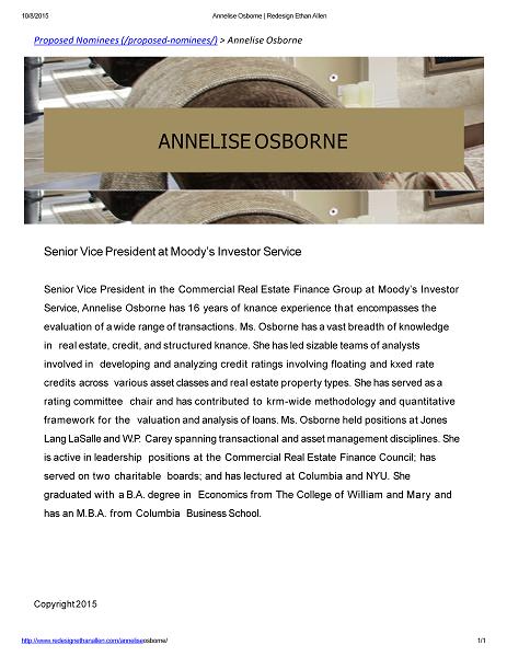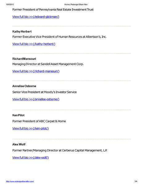 10/8/2015 Home | Redesign Ethan Allen Former President of Pennsylvania Real Estate Investment Trust View full bio >> (/edward - glickman/) Kathy Herbert Former Executive Vice President of Human Resources at Albertson’s, Inc. View full bio >> (/kathy - herbert/) Richard Mansouri Managing Director at Sandell Asset Management Corp. View full bio >> (/richard - mansouri/) Annelise Osborne Senior Vice President at Moody’s Investor Service View full bio >> (/annelise - osborne/) Ken Pilot Former President of ABC Carpet & Home View full bio >> (/ken - pilot/) Alex Wolf Former Partner/Managing Director at Cerberus Capital Management, L.P. View full bio >> (/alex - wolf/) http://www.redesignethanallen.com/ 3 / 4