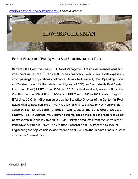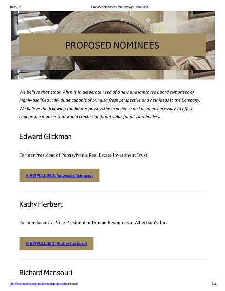 10/8/2015 Proposed Nominees for Redesign Ethan Allen PROPOSED NOMINEES We believe that Ethan Allen is in desperate need of a new and improved Board comprised of highly - qualified individuals capable of bringing fresh perspective and new ideas to the Company. We believe the following candidates possess the experience and acumen necessary to effect change in a manner that would create significant value for all shareholders. Edward Glickman Former President of Pennsylvania Real Estate Investment Trust VIEW FULL BIO (/edward - glickman/) Kathy Herbert Former Executive Vice President of Human Resources at Albertson’s, Inc. VIEW FULL BIO (/kathy - herbert/) Richard Mansouri http://www.redesignethanallen.com/proposed nominees/ 1 / 3