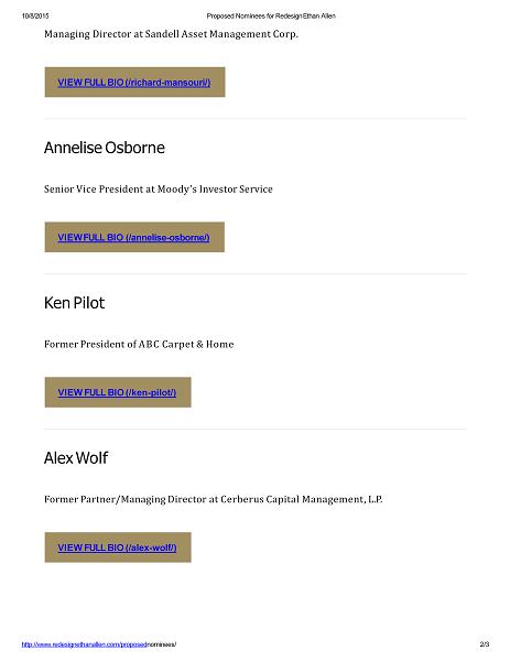 10/8/2015 Proposed Nominees for Redesign Ethan Allen Managing Director at Sandell Asset Management Corp. VIEW FULL BIO (/richard - mansouri/) Annelise Osborne Senior Vice President at Moody’s Investor Service VIEW FULL BIO (/annelise - osborne/) Ken Pilot Former President of ABC Carpet & Home VIEW FULL BIO (/ken - pilot/) Alex Wolf http://www.redesignethanallen.com/proposed nominees/ 2 / 3 Former Partner/Managing Director at Cerberus Capital Management, L.P. VIEW FULL BIO (/alex - wolf/)