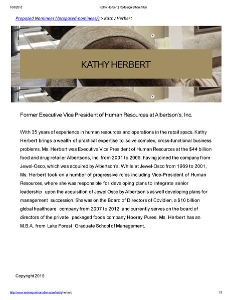 10/8/2015 Kathy Herbert | Redesign Ethan Allen Proposed Nominees (/proposed - nominees/) > Kathy Herbert http://www.redesignethanallen.com/kathy herbert/ 1 / 1 KATHY HERBERT Former Executive Vice President of Human Resources at Albertson’s, Inc. With 35 years of experience in human resources and operations in the retail space, Kathy Herbert brings a wealth of practical expertise to solve complex, cross - functional business problems. Ms. Herbert was Executive Vice President of Human Resources at the $44 billion food and drug retailer Albertsons, Inc. from 2001 to 2006, having joined the company from Jewel - Osco, which was acquired by Albertson’s. While at Jewel - Osco from 1969 to 2001, Ms. Herbert took on a number of progressive roles including Vice - President of Human Resources, where she was responsible for developing plans to integrate senior leadership upon the acquisition of Jewel Osco by Albertson’s as well developing plans for management succession. She was on the Board of Directors of Covidien, a $10 billion global healthcare company from 2007 to 2012, and currently serves on the board of directors of the private packaged foods company Hooray Puree. Ms. Herbert has an M.B.A. from Lake Forest Graduate School of Management. Copyright 2015