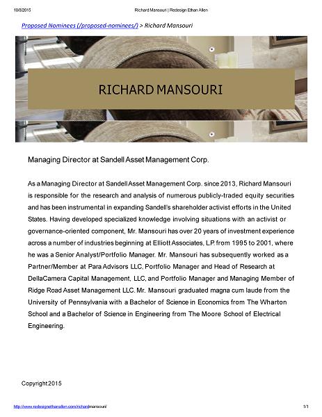 10/8/2015 Richard Mansouri | Redesign Ethan Allen Proposed Nominees (/proposed - nominees/) > Richard Mansouri http://www.redesignethanallen.com/richard mansouri/ 1 / 1 RICHARD MANSOURI Managing Director at Sandell Asset Management Corp. As a Managing Director at Sandell Asset Management Corp. since 2013, Richard Mansouri is responsible for the research and analysis of numerous publicly - traded equity securities and has been instrumental in expanding Sandell’s shareholder activist efforts in the United States. Having developed specialized knowledge involving situations with an activist or governance - oriented component, Mr. Mansouri has over 20 years of investment experience across a number of industries beginning at Elliott Associates, L.P. from 1995 to 2001, where he was a Senior Analyst/Portfolio Manager. Mr. Mansouri has subsequently worked as a Partner/Member at Para Advisors LLC, Portfolio Manager and Head of Research at DellaCamera Capital Management, LLC, and Portfolio Manager and Managing Member of Ridge Road Asset Management LLC. Mr. Mansouri graduated magna cum laude from the University of Pennsylvania with a Bachelor of Science in Economics from The Wharton School and a Bachelor of Science in Engineering from The Moore School of Electrical Engineering. Copyright 2015