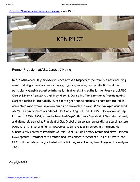 10/8/2015 Ken Pilot | Redesign Ethan Allen Proposed Nominees (/proposed - nominees/) > Ken Pilot http://www.redesignethanallen.com/ken pilot/ 1 / 1 KEN PILOT Former President of ABC Carpet & Home Ken Pilot has over 30 years of experience across all aspects of the retail business including merchandising, operations, e - commerce, logistics, sourcing and production and has particularly valuable expertise in home furnishing retailing as the former President of ABC Carpet & Home from 2010 until May of 2015. During Mr. Pilot’s tenure as President, ABC Carpet doubled in proktability over a three year period and saw a sharp turnaround in comp store sales, which increased during his leadership to over +20% from a previous level of - 7%. Currently the co - founder of Pilot Consulting Practice LLC, Mr. Pilot worked at Gap, Inc. from 1989 to 2002, where he launched Gap Outlet, was President of Gap International, and ultimately served as President of Gap Global overseeing merchandising, sourcing, store operations, knance, and human resources, with revenues in excess of $4 billion. He subsequently served as President of Polo Ralph Lauren Factory Stores and New Business Development, President of the Martin and Osa concept at American Eagle Outktters, and CEO of RobotGalaxy. He graduated with a B.A. degree in History from Colgate University in 1983. Copyright 2015