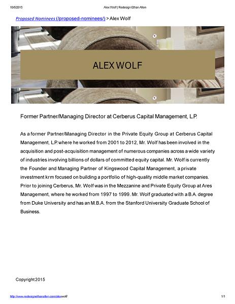 10/8/2015 Alex Wolf | Redesign Ethan Allen Proposed Nominees (/proposed - nominees/) > Alex Wolf http://www.redesignethanallen.com/alex wolf/ 1 / 1 ALEX WOLF Former Partner/Managing Director at Cerberus Capital Management, L.P. As a former Partner/Managing Director in the Private Equity Group at Cerberus Capital Management, L.P. where he worked from 2001 to 2012, Mr. Wolf has been involved in the acquisition and post - acquisition management of numerous companies across a wide variety of industries involving billions of dollars of committed equity capital. Mr. Wolf is currently the Founder and Managing Partner of Kingswood Capital Management, a private investment krm focused on building a portfolio of high - quality middle market companies. Prior to joining Cerberus, Mr. Wolf was in the Mezzanine and Private Equity Group at Ares Management, where he worked from 1997 to 1999. Mr. Wolf graduated with a B.A. degree from Duke University and has an M.B.A. from the Stanford University Graduate School of Business. Copyright 2015