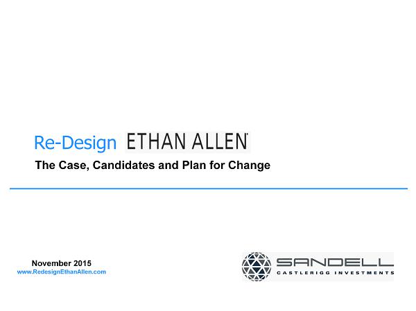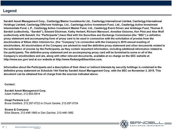 67 Strictly Confidential. Do Not Duplicate or Distribute. Legend Sandell Asset Management Corp., Castlerigg Master Investments Ltd., Castlerigg International Limited, Castlerigg Internationa l Holdings Limited, Castlerigg Offshore Holdings, Ltd., Castlerigg Active Investment Fund, Ltd., Castlerigg Active Investment Intermediate Fund, L.P., Castlerigg Active Investment Master Fund, Ltd., Castlerigg Event Driven and Arbitrage Fund, Thomas E . Sandell (collectively, “Sandell”), Edward Glickman, Kathy Herbert, Richard Mansouri, Annelise Osborne, Ken Pilot and Alex Wol f (collectively with Sandell, the “Participants”) have filed with the Securities and Exchange Commission (the “SEC”) a definiti ve proxy statement and accompanying form of proxy card to be used in connection with the solicitation of proxies from the stockholders of Ethan Allen Interiors Inc. (the “Company”) in connection with the Company’s 2015 annual meeting of stockholders. All stockholders of the Company are advised to read the definitive proxy statement and other documents related to the solicitation of proxies by the Participants, as they contain important information, including additional information rela ted to the participants. The definitive proxy statement and an accompanying proxy card will be furnished to some or all of the Company’s stockholders and are, along with other relevant documents, available at no charge on the SEC website at http://www.sec.gov/ and at our website at http://www.RedesignEthanAllen.com . Information about the Participants and a description of their direct or indirect interests by security holdings is contained in the definitive proxy statement on Schedule 14A filed by Sandell Asset Management Corp. with the SEC on November 3, 2015. This document can be obtained free of charge from the sources indicated above. Contact: Sandell Asset Management Corp. Adam Hoffman, 212 - 603 - 5814 Okapi Partners LLC Bruce Goldfarb, 212,297 - 0722 or Chuck Garske, 212 - 297 - 0724 Sloane & Company Elliot Sloane, 212 - 446 - 1860 or Dan Zacchei, 212 - 446 - 1882