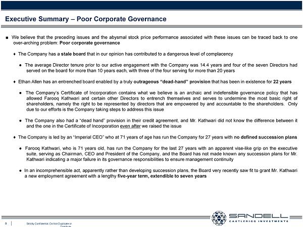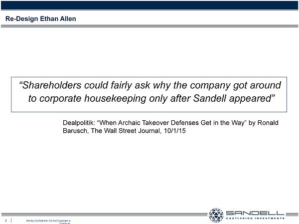 2 Strictly Confidential. Do Not Duplicate or Distribute. Re - Design Ethan Allen “Shareholders could fairly ask why the company got around to corporate housekeeping only after Sandell appeared” Dealpolitik: “When Archaic Takeover Defenses Get in the Way” by Ronald Barusch , The Wall Street Journal, 10/1/15