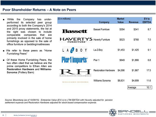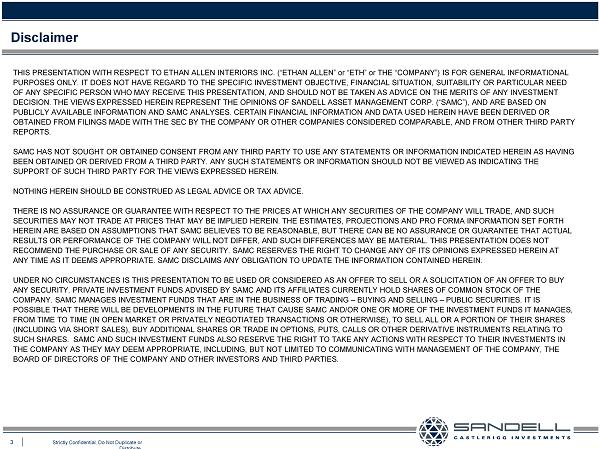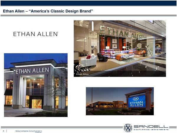 3 Strictly Confidential. Do Not Duplicate or Distribute. THIS PRESENTATION WITH RESPECT TO ETHAN ALLEN INTERIORS INC. (“ETHAN ALLEN” or “ETH ” or THE “COMPANY”) IS FOR GENERAL INFORMATIONAL PURPOSES ONLY. IT DOES NOT HAVE REGARD TO THE SPECIFIC INVESTMENT OBJECTIVE, FINANCIAL SITUATION, SUITABILITY OR PARTICULAR N EED OF ANY SPECIFIC PERSON WHO MAY RECEIVE THIS PRESENTATION, AND SHOULD NOT BE TAKEN AS ADVICE ON THE MERITS OF ANY INVESTMENT DECISION. THE VIEWS EXPRESSED HEREIN REPRESENT THE OPINIONS OF SANDELL ASSET MANAGEMENT CORP. (“SAMC”), AND ARE BASED ON PUBLICLY AVAILABLE INFORMATION AND SAMC ANALYSES. CERTAIN FINANCIAL INFORMATION AND DATA USED HEREIN HAVE BEEN DERIVED OR OBTAINED FROM FILINGS MADE WITH THE SEC BY THE COMPANY OR OTHER COMPANIES CONSIDERED COMPARABLE, AND FROM OTHER THIRD PARTY REPORTS. SAMC HAS NOT SOUGHT OR OBTAINED CONSENT FROM ANY THIRD PARTY TO USE ANY STATEMENTS OR INFORMATION INDICATED HEREIN AS HAVING BEEN OBTAINED OR DERIVED FROM A THIRD PARTY. ANY SUCH STATEMENTS OR INFORMATION SHOULD NOT BE VIEWED AS INDICATING THE SUPPORT OF SUCH THIRD PARTY FOR THE VIEWS EXPRESSED HEREIN. NOTHING HEREIN SHOULD BE CONSTRUED AS LEGAL ADVICE OR TAX ADVICE. THERE IS NO ASSURANCE OR GUARANTEE WITH RESPECT TO THE PRICES AT WHICH ANY SECURITIES OF THE COMPANY WILL TRADE, AND SUCH SECURITIES MAY NOT TRADE AT PRICES THAT MAY BE IMPLIED HEREIN. THE ESTIMATES, PROJECTIONS AND PRO FORMA INFORMATION SET FORTH HEREIN ARE BASED ON ASSUMPTIONS THAT SAMC BELIEVES TO BE REASONABLE, BUT THERE CAN BE NO ASSURANCE OR GUARANTEE THAT ACTUAL RESULTS OR PERFORMANCE OF THE COMPANY WILL NOT DIFFER, AND SUCH DIFFERENCES MAY BE MATERIAL. THIS PRESENTATION DOES NOT RECOMMEND THE PURCHASE OR SALE OF ANY SECURITY. SAMC RESERVES THE RIGHT TO CHANGE ANY OF ITS OPINIONS EXPRESSED HEREIN AT ANY TIME AS IT DEEMS APPROPRIATE. SAMC DISCLAIMS ANY OBLIGATION TO UPDATE THE INFORMATION CONTAINED HEREIN. UNDER NO CIRCUMSTANCES IS THIS PRESENTATION TO BE USED OR CONSIDERED AS AN OFFER TO SELL OR A SOLICITATION OF AN OFFER TO BUY ANY SECURITY. PRIVATE INVESTMENT FUNDS ADVISED BY SAMC AND ITS AFFILIATES CURRENTLY HOLD SHARES OF COMMON STOCK OF THE COMPANY. SAMC MANAGES INVESTMENT FUNDS THAT ARE IN THE BUSINESS OF TRADING – BUYING AND SELLING – PUBLIC SECURITIES. IT IS POSSIBLE THAT THERE WILL BE DEVELOPMENTS IN THE FUTURE THAT CAUSE SAMC AND/OR ONE OR MORE OF THE INVESTMENT FUNDS IT MANAGES, FROM TIME TO TIME (IN OPEN MARKET OR PRIVATELY NEGOTIATED TRANSACTIONS OR OTHERWISE), TO SELL ALL OR A PORTION OF THEIR SHARE S (INCLUDING VIA SHORT SALES), BUY ADDITIONAL SHARES OR TRADE IN OPTIONS, PUTS, CALLS OR OTHER DERIVATIVE INSTRUMENTS RELATING TO SUCH SHARES. SAMC AND SUCH INVESTMENT FUNDS ALSO RESERVE THE RIGHT TO TAKE ANY ACTIONS WITH RESPECT TO THEIR INVESTMENTS IN THE COMPANY AS THEY MAY DEEM APPROPRIATE, INCLUDING, BUT NOT LIMITED TO COMMUNICATING WITH MANAGEMENT OF THE COMPANY, THE BOARD OF DIRECTORS OF THE COMPANY AND OTHER INVESTORS AND THIRD PARTIES. Disclaimer