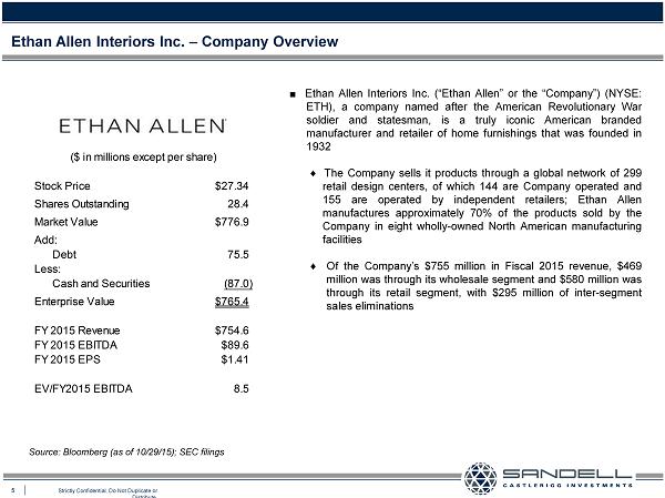 4 Strictly Confidential. Do Not Duplicate or Distribute. Ethan Allen – “America’s Classic Design Brand”