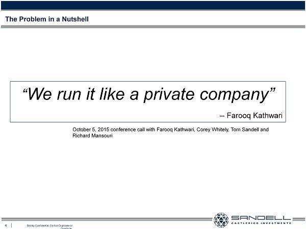 6 Strictly Confidential. Do Not Duplicate or Distribute. The Problem in a Nutshell “ We run it like a private company” -- Farooq Kathwari October 5, 2015 conference call with Farooq Kathwari, Corey Whitely, Tom Sandell and Richard Mansouri