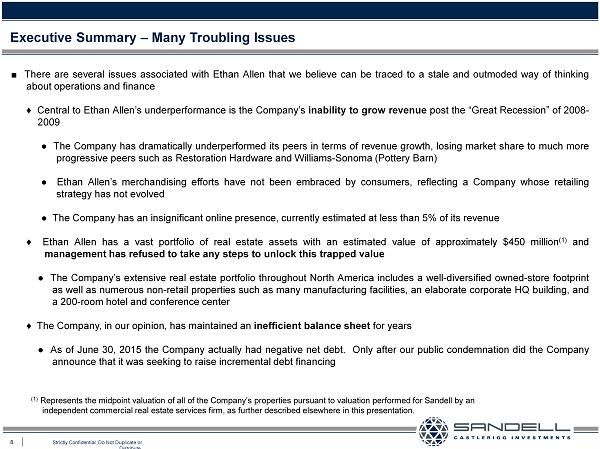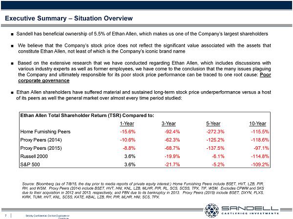 7 Strictly Confidential. Do Not Duplicate or Distribute. Executive Summary – Situation Overview Ŷ Sandell has beneficial ownership of 5 . 5 % of Ethan Allen, which makes us one of the Company’s largest shareholders Ŷ We believe that the Company’s stock price does not reflect the significant value associated with the assets that constitute Ethan Allen, not least of which is the Company’s iconic brand name Ŷ Based on the extensive research that we have conducted regarding Ethan Allen, which includes discussions with various industry experts as well as former employees, we have come to the conclusion that the many issues plaguing the Company and ultimately responsible for its poor stock price performance can be traced to one root cause : Poor corporate governance Ŷ Ethan Allen shareholders have suffered material and sustained long - term stock price underperformance versus a host of its peers as well the general market over almost every time period studied : Source : Bloomberg (as of 7 / 8 / 15 , the day prior to media reports of private equity interest . ) Home Furnishing Peers include BSET, HVT, LZB, PIR, RH, and WSM . Proxy Peers ( 2014 ) include BSET, HVT, HNI, KNL, LZB, MLHR, PIR, RL, SCS, SCSS, TPX, TIF, WSM . Excludes CPWM and SKS due to their acquisition in 2012 and 2013 , respectively, and FBN due to its bankruptcy in 2013 . Proxy Peers ( 2015 ) include BSET, DXYN, FLXS, KIRK, TUMI, HVT, KNL, SCSS, KATE, KBAL, LZB, RH, PIR, MLHR, HNI, SCS, TPX . Ethan Allen Total Shareholder Return (TSR) Compared to: 1-Year 3-Year 5-Year 10-Year Home Furnishing Peers -15.6% -92.4% -272.3% -115.5% Proxy Peers (2014) -10.6% -62.3% -125.2% -118.6% Proxy Peers (2015) -8.8% -68.7% -137.5% -97.1% Russell 2000 3.6% -19.9% -6.1% -114.8% S&P 500 3.6% -21.7% -5.2% -109.2%