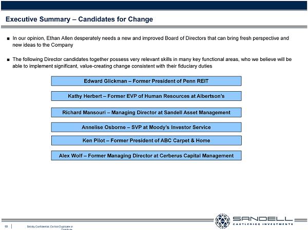 9 Strictly Confidential. Do Not Duplicate or Distribute. Executive Summary – Poor Corporate Governance ■ We believe that the preceding issues and the abysmal stock price performance associated with these issues can be traced back to one over - arching problem : Poor corporate governance Ƈ The Company has a stale board that in our opinion has contributed to a dangerous level of complacency Ɣ The average Director tenure prior to our active engagement with the Company was 14 . 4 years and four of the seven Directors had served on the board for more than 10 years each, with three of the four serving for more than 20 years Ƈ Ethan Allen has an entrenched board enabled by a truly outrageous “dead - hand” provision that has been in existence for 22 years Ɣ The Company’s Certificate of Incorporation contains what we believe is an archaic and indefensible governance policy that has allowed Farooq Kathwari and certain other Directors to entrench themselves and serves to undermine the most basic right of shareholders, namely the right to be represented by directors that are empowered by and accountable to the shareholders . Only due to our efforts is the Company taking steps to address this issue Ɣ The Company also had a “dead hand” provision in their credit agreement, and Mr . Kathwari did not know the difference between it and the one in the Certificate of Incorporation even after we raised the issue Ƈ The Company is led by an “Imperial CEO” who at 71 years of age has run the Company for 27 years with no defined succession plans Ɣ Farooq Kathwari, who is 71 years old, has run the Company for the last 27 years with an apparent vise - like grip on the executive suite, serving as Chairman, CEO and President of the Company, and the Board has not made known any succession plans for Mr . Kathwari indicating a major failure in its governance responsibilities to ensure management continuity Ɣ In an incomprehensible act, apparently rather than developing succession plans, the Board very recently saw fit to grant Mr . Kathwari a new employment agreement with a lengthy five - year term, extendible to seven years