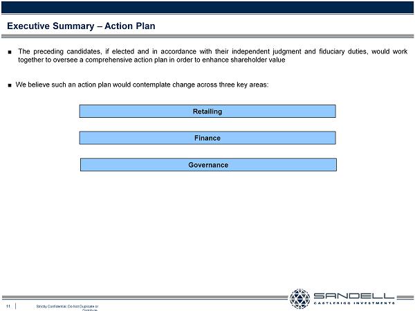 11 Strictly Confidential. Do Not Duplicate or Distribute. Executive Summary – Action Plan ■ The preceding candidates, if elected and in accordance with their independent judgment and fiduciary duties, would work together to oversee a comprehensive action plan in order to enhance shareholder value Ŷ We believe such an action plan would contemplate change across three key areas : Retailing Finance Governance