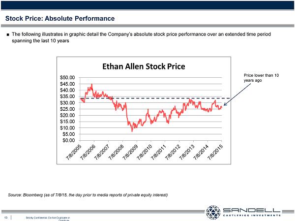 12 Strictly Confidential. Do Not Duplicate or Distribute. Poor Shareholder Returns – A Note on Peers ■ While the Company has under - performed its selected peer group according to both the Company’s 2014 and 2015 proxy statements, the list at the right was chosen to include comparable companies that are primarily involved in the sale of home furnishings as opposed to the sale of office furniture or bedding/mattresses Ŷ We refer to these peers as “Home Furnishing Peers” Ŷ Of these Home Furnishing Peers, the two often cited that we believe are the prime competitors to Ethan Allen are Restoration Hardware and Williams - Sonoma (Pottery Barn) Source: Bloomberg (as of 10/29/15). Enterprise Value (EV) is to LTM EBITDA with Haverty adjusted for pension settlement expense and Restoration Hardware adjusted for stock - based compensation expense. ($ in millions) Market EV to Company Value Revenue EBITDA Basset Furniture $354 $341 8.7 Haverty Furniture $523 $768 7.0 La-Z-Boy $1,453 $1,425 9.1 Pier 1 $649 $1,866 6.8 Restoration Hardware $4,096 $1,867 17.5 Williams Sonoma $6,631 $4,699 11.6 Average 10.1