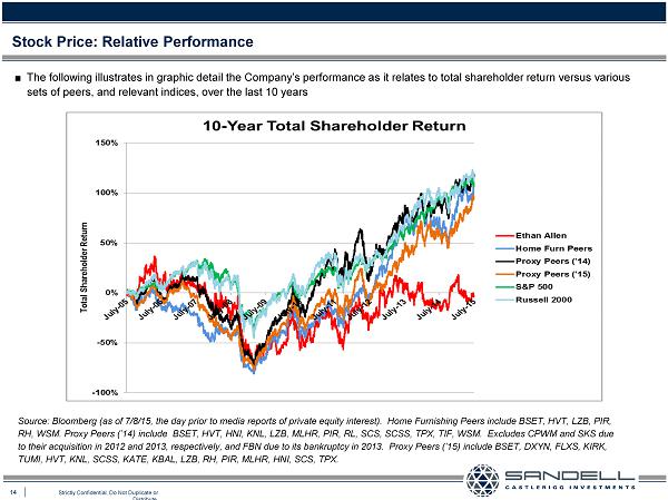 13 Strictly Confidential. Do Not Duplicate or Distribute. Ŷ The following illustrates in graphic detail the Company’s absolute stock price performance over an extended time period spanning the last 10 years Stock Price: Absolute Performance Source: Bloomberg (as of 7/8/15, the day prior to media reports of private equity interest ) Price lower than 10 years ago