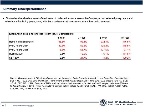 14 Strictly Confidential. Do Not Duplicate or Distribute. Ŷ The following illustrates in graphic detail the Company’s performance as it relates to total shareholder return versus variou s sets of peers, and relevant indices, over the last 10 years Stock Price: Relative Performance Source: Bloomberg (as of 7/8/15, the day prior to media reports of private equity interest). Home Furnishing Peers include BSET, HVT, LZB, PIR, RH, WSM. Proxy Peers (’14) include BSET, HVT, HNI, KNL, LZB, MLHR, PIR, RL, SCS, SCSS, TPX, TIF, WSM. Excludes CPWM and SKS du e to their acquisition in 2012 and 2013, respectively, and FBN due to its bankruptcy in 2013. Proxy Peers (’15) include BSET, DXY N, FLXS, KIRK, TUMI, HVT, KNL, SCSS, KATE, KBAL, LZB, RH, PIR, MLHR, HNI, SCS, TPX.