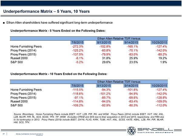 16 Strictly Confidential. Do Not Duplicate or Distribute. Underperformance Matrix – 1 Year, 3 Years Ŷ We have analyzed the Company’s underperformance over several time periods, using several specific dates of reference: Ɣ July 8, the day prior to media reports of private equity interest (and one week prior to Tom Sandell’s Ethan Allen presentati on at the CNBC Delivering Alpha Conference) Ɣ August 13, the day before Sandell sent public letter noting its 5.5% ownership interest in Ethan Allen Ɣ September 14, the day before Sandell nominated its slate of Director candidates Ɣ October 29, the day approximating current prices Source : Bloomberg . Home Furnishing Peers include BSET, HVT, LZB, PIR, RH, and WSM . Proxy Peers ( 2014 ) include BSET, HVT, HNI, KNL, LZB, MLHR, PIR, RL, SCS, SCSS, TPX, TIF, WSM . Excludes CPWM and SKS due to their acquisition in 2012 and 2013 , respectively, and FBN due to its bankruptcy in 2013 . Proxy Peers ( 2015 ) include BSET, DXYN, FLXS, KIRK, TUMI, HVT, KNL, SCSS, KATE, KBAL, LZB, RH, PIR, MLHR, HNI, SCS, TPX . Underperformance Matrix - 1 Year Ended on the Following Dates: Ethan Allen Relative TSR Versus: 7/8/2015 8/13/2015 9/14/2015 10/29/2015 Home Furnishing Peers -15.6% 8.3% -3.4% -23.5% Proxy Peers (2014) -10.6% 16.3% 10.7% -9.4% Proxy Peers (2015) -8.8% 15.8% 11.3% -9.6% Russell 2000 3.6% 27.6% 23.0% -4.0% S&P 500 3.6% 25.3% 23.4% -8.4% Underperformance Matrix - 3 Years Ended on the Following Dates: Ethan Allen Relative TSR Versus: 7/8/2015 8/13/2015 9/14/2015 10/29/2015 Home Furnishing Peers -92.4% -59.4% -51.7% -74.4% Proxy Peers (2014) -62.3% -31.3% -22.9% -68.7% Proxy Peers (2015) -68.7% -41.5% -33.2% -76.6% Russell 2000 -19.9% -3.9% -6.1% -49.8% S&P 500 -21.7% -4.5% -8.6% -57.4%