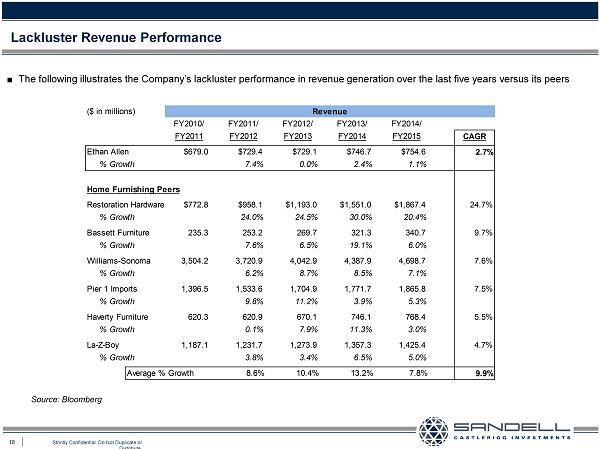 8 Strictly Confidential. Do Not Duplicate or Distribute. Executive Summary – Many Troubling Issues ■ There are several issues associated with Ethan Allen that we believe can be traced to a stale and outmoded way of thinking about operations and finance Ƈ Central to Ethan Allen’s underperformance is the Company’s inability to grow revenue post the “Great Recession” of 2008 - 2009 Ɣ The Company has dramatically underperformed its peers in terms of revenue growth, losing market share to much more progressive peers such as Restoration Hardware and Williams - Sonoma (Pottery Barn) Ɣ Ethan Allen’s merchandising efforts have not been embraced by consumers, reflecting a Company whose retailing strategy has not evolved Ɣ The Company has an insignificant online presence, currently estimated at less than 5 % of its revenue Ƈ Ethan Allen has a vast portfolio of real estate assets with an estimated value of approximately $ 450 million ( 1 ) and management has refused to take any steps to unlock this trapped value Ɣ The Company’s extensive real estate portfolio throughout North America includes a well - diversified owned - store footprint as well as numerous non - retail properties such as many manufacturing facilities, an elaborate corporate HQ building, and a 200 - room hotel and conference center Ƈ The Company, in our opinion, has maintained an inefficient balance s heet for years Ɣ As of June 30 , 2015 the Company actually had negative net debt . Only after our public condemnation did the Company announce that it was seeking to raise incremental debt financing (1) Represents the midpoint valuation of all of the Company’s properties pursuant to valuation performed for Sandell by an independent commercial real estate services firm, as further described elsewhere in this presentation.