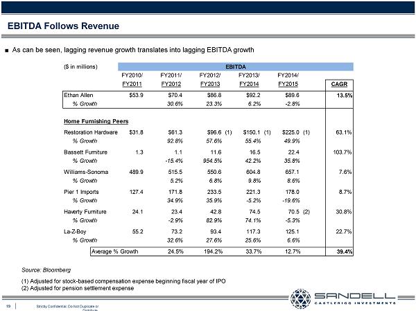 18 Strictly Confidential. Do Not Duplicate or Distribute. Lackluster Revenue Performance Ŷ The following illustrates the Company’s lackluster performance in revenue generation over the last five years versus its peer s Source: Bloomberg ($ in millions) Revenue FY2010/ FY2011/ FY2012/ FY2013/ FY2014/ FY2011 FY2012 FY2013 FY2014 FY2015 CAGR Ethan Allen $679.0 $729.4 $729.1 $746.7 $754.6 2.7% % Growth 7.4% 0.0% 2.4% 1.1% Home Furnishing Peers Restoration Hardware $772.8 $958.1 $1,193.0 $1,551.0 $1,867.4 24.7% % Growth 24.0% 24.5% 30.0% 20.4% Bassett Furniture 235.3 253.2 269.7 321.3 340.7 9.7% % Growth 7.6% 6.5% 19.1% 6.0% Williams-Sonoma 3,504.2 3,720.9 4,042.9 4,387.9 4,698.7 7.6% % Growth 6.2% 8.7% 8.5% 7.1% Pier 1 Imports 1,396.5 1,533.6 1,704.9 1,771.7 1,865.8 7.5% % Growth 9.8% 11.2% 3.9% 5.3% Haverty Furniture 620.3 620.9 670.1 746.1 768.4 5.5% % Growth 0.1% 7.9% 11.3% 3.0% La-Z-Boy 1,187.1 1,231.7 1,273.9 1,357.3 1,425.4 4.7% % Growth 3.8% 3.4% 6.5% 5.0% Average % Growth 8.6% 10.4% 13.2% 7.8% 9.9%