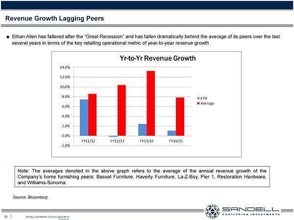 19 Strictly Confidential. Do Not Duplicate or Distribute. EBITDA Follows Revenue Ŷ As can be seen, lagging revenue growth translates into lagging EBITDA growth Source: Bloomberg (1) Adjusted for stock - based compensation expense beginning fiscal year of IPO (2) Adjusted for pension settlement expense ($ in millions) EBITDA FY2010/ FY2011/ FY2012/ FY2013/ FY2014/ FY2011 FY2012 FY2013 FY2014 FY2015 CAGR Ethan Allen $53.9 $70.4 $86.8 $92.2 $89.6 13.5% % Growth 30.6% 23.3% 6.2% -2.8% Home Furnishing Peers Restoration Hardware $31.8 $61.3 $96.6 (1) $150.1 (1) $225.0 (1) 63.1% % Growth 92.8% 57.6% 55.4% 49.9% Bassett Furniture 1.3 1.1 11.6 16.5 22.4 103.7% % Growth -15.4% 954.5% 42.2% 35.8% Williams-Sonoma 489.9 515.5 550.6 604.8 657.1 7.6% % Growth 5.2% 6.8% 9.8% 8.6% Pier 1 Imports 127.4 171.8 233.5 221.3 178.0 8.7% % Growth 34.9% 35.9% -5.2% -19.6% Haverty Furniture 24.1 23.4 42.8 74.5 70.5 (2) 30.8% % Growth -2.9% 82.9% 74.1% -5.3% La-Z-Boy 55.2 73.2 93.4 117.3 125.1 22.7% % Growth 32.6% 27.6% 25.6% 6.6% Average % Growth 24.5% 194.2% 33.7% 12.7% 39.4%