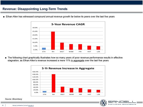 20 Strictly Confidential. Do Not Duplicate or Distribute. Ŷ Ethan Allen has faltered after the “Great Recession” and has fallen dramatically behind the average of its peers over the las t several years in terms of the key retailing operational metric of year - to - year revenue growth Revenue Growth Lagging Peers Source: Bloomberg Note : The averages denoted in the above graph refers to the average of the annual revenue growth of the Company’s home furnishing peers : Basset Furniture, Haverty Furniture, La - Z - Boy, Pier 1 , Restoration Hardware, and Williams - Sonoma .