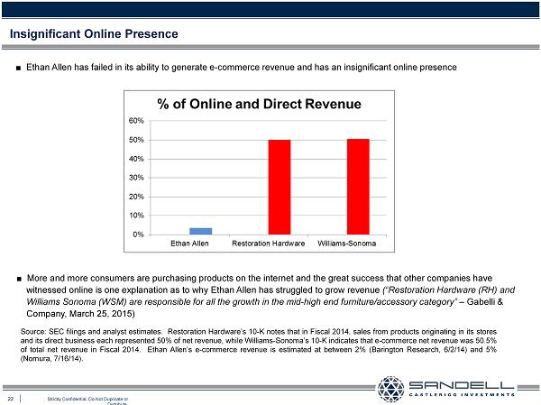 22 Strictly Confidential. Do Not Duplicate or Distribute. Ŷ Ethan Allen has failed in its ability to generate e - commerce revenue and has an insignificant online presence Insignificant Online Presence Source : SEC filings and analyst estimates . Restoration Hardware’s 10 - K notes that in Fiscal 2014 , sales from products originating in its stores and its direct business each represented 50 % of net revenue, while Williams - Sonoma’s 10 - K indicates that e - commerce net revenue was 50 . 5 % of total net revenue in Fiscal 2014 . Ethan Allen’s e - commerce revenue is estimated at between 2 % (Barington Research, 6 / 2 / 14 ) and 5 % (Nomura, 7 / 16 / 14 ) . Ŷ More and more consumers are purchasing products on the internet and the great success that other companies have witnessed online is one explanation as to why Ethan Allen has struggled to grow revenue (“ Restoration Hardware (RH) and Williams Sonoma (WSM) are responsible for all the growth in the mid - high end furniture/accessory category” – Gabelli & Company, March 25, 2015)