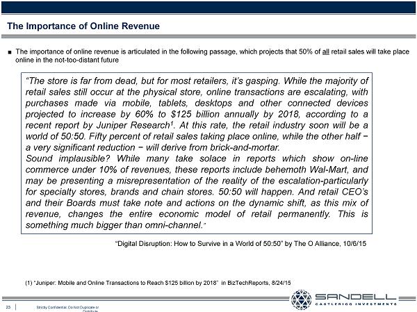 23 Strictly Confidential. Do Not Duplicate or Distribute. The Importance of Online Revenue ■ T he importance of online revenue is articulated in the following passage, which projects that 50 % of all retail sales will take place online in the not - too - distant future “The store is far from dead, but for most retailers, it’s gasping . While the majority of retail sales still occur at the physical store, online transactions are escalating, with purchases made via mobile, tablets, desktops and other connected devices projected to increase by 60 % to $ 125 billion annually by 2018 , according to a recent report by Juniper Research 1 . At this rate, the retail industry soon will be a world of 50 : 50 . Fifty percent of retail sales taking place online, while the other half − a very significant reduction − will derive from brick - and - mortar . Sound implausible? While many take solace in reports which show on - line commerce under 10 % of revenues, these reports include behemoth Wal - Mart, and may be presenting a misrepresentation of the reality of the escalation - particularly for specialty stores, brands and chain stores . 50 : 50 will happen . And retail CEO’s and their Boards must take note and actions on the dynamic shift, as this mix of revenue, changes the entire economic model of retail permanently . This is something much bigger than omni - channel . ” “Digital Disruption: How to Survive in a World of 50:50” by The O Alliance, 10/6/15 (1) “Juniper: Mobile and Online Transactions to Reach $125 billion by 2018” in BizTechReports, 8/24/15