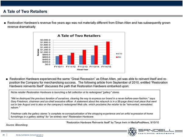 24 Strictly Confidential. Do Not Duplicate or Distribute. Ŷ Restoration Hardware’s revenue five years ago was not materially different from Ethan Allen and has subsequently grown revenue dramatically A Tale of Two Retailers Source: Bloomberg Ŷ Restoration Hardware experienced the same “Great Recession” as Ethan Allen, yet was able to reinvent itself and re - position the Company for merchandising success. The following article from September of 2010, entitled “Restoration Hardware reinvents Itself” discusses the path that Restoration Hardware embarked upon: Niche retailer Restoration Hardware is launching a fall collection at its redesigned "gallery" stores. "We've destroyed the previous iteration of ourselves, clearing the way to express our brand in a never - before - seen fashion," say s Gary Friedman, chairman and co - chief executive officer. A statement about the relaunch is in a 56 - page direct mail piece that we nt out in late August and is also on the company's redesigned Web site, which proclaims the retailer to be "reinvented, remodele d, reborn." Friedman calls the gallery stores "a complete re - conceptualization of the shopping experience and an artful expression of home furnishings in a gallery setting" for "an entirely new" Restoration Hardware. “Restoration Hardware Reinvents Itself” by Tanya Irwin in MediaPostNews, 9/10/10