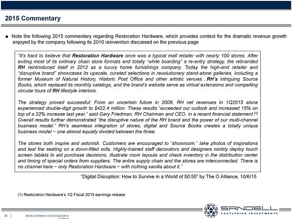 25 Strictly Confidential. Do Not Duplicate or Distribute. 2015 Commentary ■ Note the following 2015 commentary regarding Restoration Hardware, which provides context for the dramatic revenue growth enjoyed by the company following its 2010 reinvention discussed on the previous page “It’s hard to believe that Restoration Hardware once was a typical mall retailer with nearly 100 stores . After exiting most of its ordinary chain store formats and totally “white boarding” a re - entry strategy, the rebranded RH reintroduced itself in 2012 as a luxury home furnishings company . Today the high - end retailer and “disruptive brand” showcases its upscale, curated selections in revolutionary stand - alone galleries, including a former Museum of Natural History, Historic Post Office and other artistic venues … RH’s intriguing Source Books, which replaced its monthly catalogs, and the brand’s website serve as virtual extensions and compelling circular tours of RH lifestyle interiors . The strategy proved successful : From an uncertain future in 2008 , RH net revenues in 1 Q 2015 alone experienced double - digit growth to $ 422 . 4 million . These results “exceeded our outlook and increased 15 % on top of a 22 % increase last year,” said Gary Friedman, RH Chairman and CEO, in a recent financial statement . [ 1 ] Overall results further demonstrated “the disruptive nature of the RH brand and the power of our multi - channel business model . ” RH’s seamless integration of stores, digital and Source Books creates a totally unique business model − one almost equally divided between the three . The stores both inspire and astonish . Customers are encouraged to “showroom,” take photos of inspirations and test the seating on a down - filled sofa . Highly - trained staff decorators and designers nimbly deploy touch screen tablets to aid purchase decisions, illustrate room layouts and check inventory in the distribution center and timing of special orders from suppliers . The entire supply chain and the stores are interconnected . There is no channel here − only Restoration Hardware − with nothing vanilla about it . ” “Digital Disruption: How to Survive in a World of 50:50” by The O Alliance, 10/6/15 (1) Restoration Hardware’s 1Q Fiscal 2015 earnings release