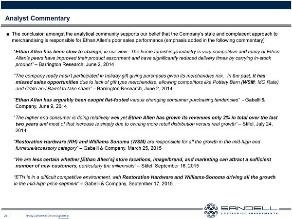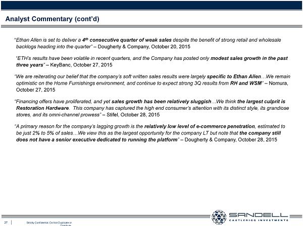26 Strictly Confidential. Do Not Duplicate or Distribute. Ŷ The conclusion amongst the analytical community supports our belief that the Company’s stale and complacent approach to merchandising is responsible for Ethan Allen’s poor sales performance (emphasis added in the following commentary) “ Ethan Allen has been slow to change , in our view. The home furnishings industry is very competitive and many of Ethan Allen’s peers have improved their product assortment and have significantly reduced delivery times by carrying in - stock product” – Barrington Research, June 2, 2014 “The company really hasn’t participated in holiday gift giving purchases given its merchandise mix. In the past, it has missed sales opportunities due to lack of gift type merchandise, allowing competitors like Pottery Barn ( WSM ; MO Rate) and Crate and Barrel to take share” – Barrington Research, June 2, 2014 “ Ethan Allen has arguably been caught flat - footed versus changing consumer purchasing tendencies” - Gabelli & Company, June 9, 2014 “ The higher end consumer is doing relatively well yet Ethan Allen has grown its revenues only 2% in total over the last two years and most of that increase is simply due to owning more retail distribution versus real growth” – Stifel, July 24, 2014 “ Restoration Hardware (RH) and Williams Sonoma (WSM) are responsible for all the growth in the mid - high end furniture/accessory category” – Gabelli & Company, March 25, 2015 “We are less certain whether [Ethan Allen’s] store locations, image/brand, and marketing can attract a sufficient number of new customers , particularly the millennials” – Stifel, September 16, 2015 “ETH is in a difficult competitive environment, with Restoration Hardware and Williams - Sonoma driving all the growth in the mid - high price segment” – Gabelli & Company, September 17, 2015 Analyst Commentary