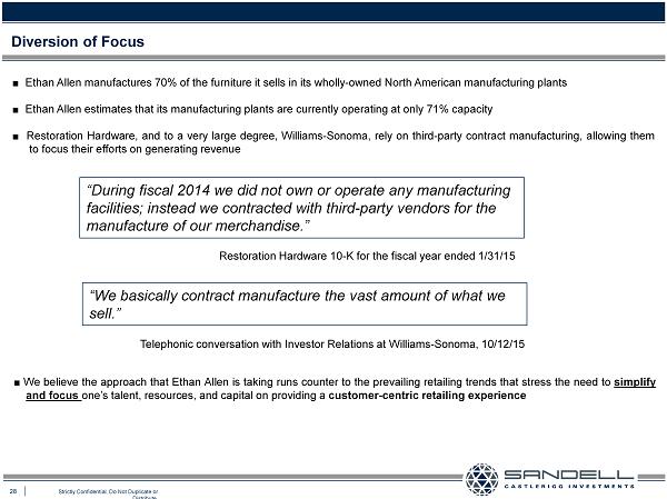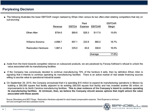 28 Strictly Confidential. Do Not Duplicate or Distribute. Diversion of Focus ■ Ethan Allen manufactures 70 % of the furniture it sells in its wholly - owned North American manufacturing plants ■ Ethan Allen estimates that its manufacturing plants are currently operating at only 71 % capacity Ŷ Restoration Hardware, and to a very large degree, Williams - Sonoma, rely on third - party contract manufacturing, allowing them to focus their efforts on generating revenue “During fiscal 2014 we did not own or operate any manufacturing facilities; instead we contracted with third - party vendors for the manufacture of our merchandise.” Restoration Hardware 10 - K for the fiscal year ended 1/31/15 “We basically contract manufacture the vast amount of what we sell.” Telephonic conversation with Investor Relations at Williams - Sonoma, 10/12/15 ■ We believe the approach that Ethan Allen is taking runs counter to the prevailing retailing trends that stress the need to simplify and focus one’s talent, resources, and capital on providing a customer - centric retailing experience