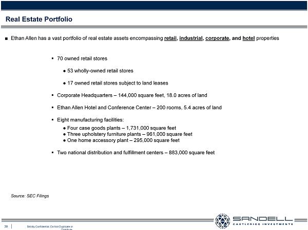 29 Strictly Confidential. Do Not Duplicate or Distribute. Perplexing Decision Rent EBITDAR Revenue EBITDA Expense EBITDAR Margin Ethan Allen $754.6 $89.6 $28.3 $117.9 15.6% Williams-Sonoma 4,698.7 657.1 222.9 880.0 18.7% Restoration Hardware 1,867.4 225.0 83.6 308.6 16.5% Average 17.6% ■ Aside from the trend towards competitor reliance on outsourced products, we are perplexed by Farooq Kathwari’s refusal to unlock the value associated with its manufacturing facilities ■ If the Company has consciously decided to continue manufacturing 70 % of the furniture it sells, then by definition Ethan Allen is signaling that it intends to continue operating its manufacturing facilities . There is an active market of real estate financing sources willing to ascribe value to operational industrial assets Ŷ On September 29 , 2015 , the Company announced that it is spending $ 15 million to expand its manufacturing operations in Mexico by building a 300 , 000 square foot facility adjacent to its existing 260 , 000 square foot facility and has invested another $ 5 million on improvements to its North Carolina manufacturing facilities . This is clear evidence of the Company’s intent to continue operating its manufacturing facilities . At minimum, then, we believe the Company should assess options that might unlock the value associated with these assets ■ The following illustrates the lower EBITDAR margin realized by Ethan Allen versus its two often - cited retailing competitors that rely on out - sourcing Source: Bloomberg and SEC Filings. Restoration Hardware adjusted for stock - based compensation expense. Rent Expense is minimum rent and contingent rent less sublease income.