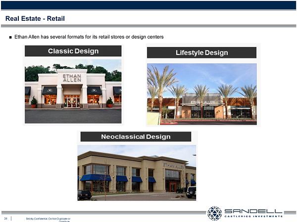 31 Strictly Confidential. Do Not Duplicate or Distribute. Ŷ Ethan Allen has several formats for its retail stores or design centers Real Estate - Retail