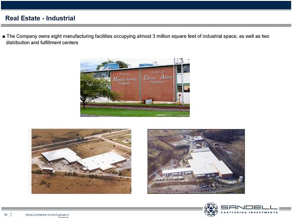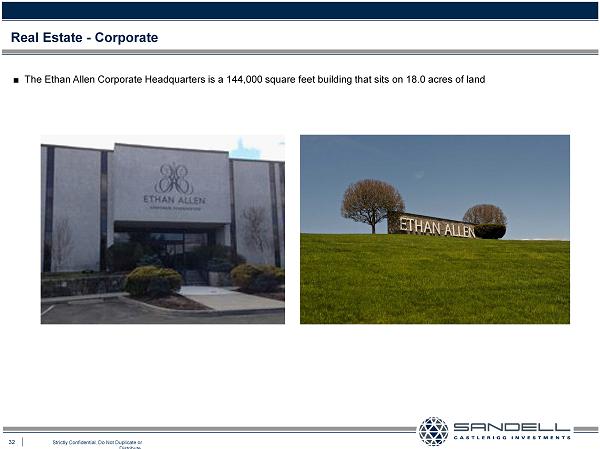 32 Strictly Confidential. Do Not Duplicate or Distribute. Ŷ The Ethan Allen Corporate Headquarters is a 144,000 square feet building that sits on 18.0 acres of land Real Estate - Corporate