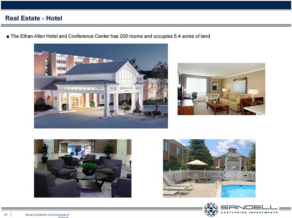 33 Strictly Confidential. Do Not Duplicate or Distribute. Ŷ The Ethan Allen Hotel and Conference Center has 200 rooms and occupies 5.4 acres of land Real Estate - Hotel