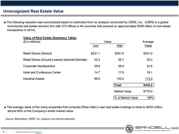 54 Strictly Confidential. Do Not Duplicate or Distribute. Ŷ The Company owns its corporate headquarters, which consists of a 144 , 000 square feet office building that sits on 18 . 0 acres of land . Adjacent to its headquarters is the wholly - owned Ethan Allen Hotel and Conference Center, which has 200 rooms on a 5 . 4 - acre parcel of land » We would recommend that the Company take steps to sell its hotel and re - invest this currently trapped capital in the Company . There is no operating efficiency associated with a furniture retailer owning a hotel and conference center ; a hotel is a business that should be owned and run by a hotel operator » We believe Ethan Allen should pursue a sale - leaseback of its corporate headquarters, which would allow the Company to allocate capital to initiatives that generate higher returns for shareholders . Leasing an office property is often a much more efficient use of capital » As indicated previously, the value of the Company’s headquarters is estimated at close to $ 33 million and the value of the hotel assets is estimated at over $ 16 million . Together, these properties may be worth close to $ 50 million ; this has an equity cost of capital associated with it and this capital could be better invested in the Company or returned to shareholders Finance: Assessment of Real Estate (Headquarters, Hotel and Industrial Assets) Ŷ We believe there is significant value associated with the Company industrial assets, which consist of numerous owned manufacturing and distribution facilities totaling over 3.8 million square feet in the United States, Honduras, and Mexico » We would recommend working in concert with the entire Board of Directors to perform an assessment of capacity utilization on a plant - by - plant basis » Ethan Allen should divide industrial facilities into those best - suited for continued operation and those targeted for closing » We believe Ethan - Allen should seek sale - leaseback options for those industrial assets best - suited for continued operation