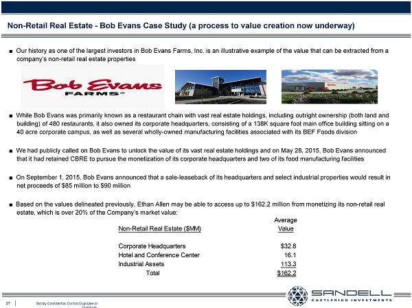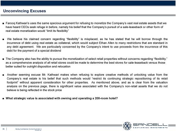 36 Strictly Confidential. Do Not Duplicate or Distribute. Ŷ Farooq Kathwari’s uses the same specious argument for refusing to monetize the Company’s vast real estate assets that we have heard CEOs seek refuge in before, namely his belief that the Company’s pursuit of a sale - leaseback or other form of real estate monetization would “limit its flexibility” Ŷ We believe his claimed concern regarding “flexibility” is misplaced, as he has stated that he will borrow through the incurrence of debt using real estate as collateral, which would subject Ethan Allen to many restrictions that are standard in any debt agreement . We are particularly concerned by the Company’s intent to use proceeds from the incurrence of this debt for the payment of a special dividend Ŷ The Company also has the ability to pursue the monetization of select retail properties without concerns regarding “flexibili t y,” as a comprehensive analysis of all retail stores could be made to determine the best stores for sale - leaseback versus those better suited for outright disposition and relocation Ŷ Another seeming excuse Mr . Kathwari makes when refusing to explore creative methods of unlocking value from the Company’s real estate is his belief that such methods would “restrict its continuing strategic repositioning of its retail footprint” without apparent consideration for other properties . As mentioned above, and as is clear from the valuation analysis on the previous page, there is significant value associated with the Company’s non - retail assets that we do not believe is being reflected in the stock price Ŷ What strategic value is associated with owning and operating a 200 - room hotel? Unconvincing Excuses