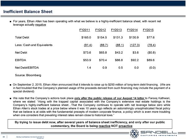 38 Strictly Confidential. Do Not Duplicate or Distribute. Inefficient Balance Sheet Ŷ For years, Ethan Allen has been operating with what we believe is a highly - inefficient balance sheet, with recent net leverage actually negative Ŷ On September 2 , 2015 , Ethan Allen announced that it intends to raise up to $ 250 million of long - term debt financing . (We are in fact troubled that the Company’s planned usage of the proceeds derived from such financing may include the payment of a special dividend) Ŷ We note that the Company’s actions took place only after the public release of our August 14 letter to Farooq Kathwari, where we stated : “Along with the trapped capital associated with the Company’s extensive real estate holdings is the Company’s highly - inefficient balance sheet … That the Company continues to operate with net leverage below zero while Ethan Allen’s stock trades at a price below where it was 10 years ago reflects an astonishingly unsophisticated fiscal policy that we believe is at odds with the fundamental precepts of modern corporate finance, a policy which is even more troubling when one considers that prevailing interest rates remain close to historical lows . ” FY2011 FY2012 FY2013 FY2014 FY2015 Total Debt $165.0 $154.5 $131.3 $130.9 $77.6 Less: Cash and Equivalents (91.4) (88.7) (88.1) (127.3) (78.4) Net Debt $73.6 $65.8 $43.2 $3.6 ($0.8) EBITDA $53.9 $70.4 $86.8 $92.2 $89.6 Net Debt/EBITDA 1.4 0.9 0.5 0.0 (0.0) Source: Bloomberg By trying to issue debt now, after several years of balance sheet inefficiency, and only after our public commentary, the Board is being reactive NOT proactive
