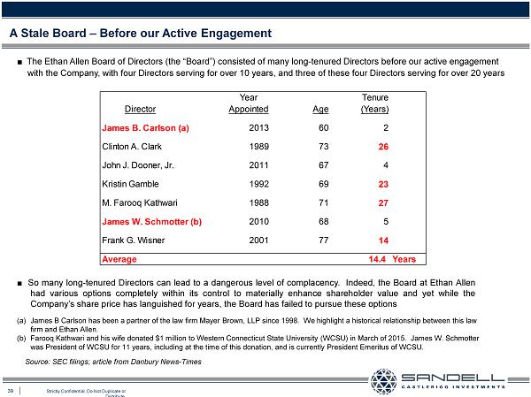 39 Strictly Confidential. Do Not Duplicate or Distribute. A Stale Board – Before our Active Engagement Ŷ The Ethan Allen Board of Directors (the “Board”) consisted of many long - tenured Directors before our active engagement with the Company, with four Directors serving for over 10 years, and three of these four Directors serving for over 20 years Ŷ So many long - tenured Directors can lead to a dangerous level of complacency . Indeed, the Board at Ethan Allen had various options completely within its control to materially enhance shareholder value and yet while the Company’s share price has languished for years, the Board has failed to pursue these options Source: SEC filings; article from Danbury News - Times (a) James B Carlson has been a partner of the law firm Mayer Brown, LLP since 1998. We highlight a historical relationship betwe en this law firm and Ethan Allen. (b) Farooq Kathwari and his wife donated $1 million to Western Connecticut State University (WCSU) in March of 2015. James W. Schmotter was President of WCSU for 11 years, including at the time of this donation, and is currently President Emeritus of WCSU . Year Tenure Director Appointed Age (Years) James B. Carlson (a) 2013 60 2 Clinton A. Clark 1989 73 26 John J. Dooner, Jr. 2011 67 4 Kristin Gamble 1992 69 23 M. Farooq Kathwari 1988 71 27 James W. Schmotter (b) 2010 68 5 Frank G. Wisner 2001 77 14 Average 14.4 Years