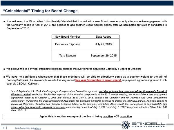 40 Strictly Confidential. Do Not Duplicate or Distribute. Ŷ It would seem that Ethan Allen “coincidentally” decided that it would add a new Board member shortly after our active engagement with the Company began in April of 2015 , and decided to add another Board member shortly after we nominated our slate of candidates in September of 2015 Ŷ We believe this is a cynical attempt to belatedly address the over - tenured nature the Company’s Board of Directors Ŷ We have no confidence whatsoever that these members will be able to effectively serve as a counter - weight to the will of Farooq Kathwari . As an example we cite the very recent five year (extendible to seven years) employment agreement granted to 71 - year old CEO Mr . Kathwari : “As of September 29 , 2015 , the Company’s Compensation Committee approved and the independent members of the Company's Board of Directors ratified , subject to Stockholder approval of the incentive components at the 2015 annual meeting, the terms of the a new employment agreement, dated as of October 1 , 2015 and effective as of July 1 , 2015 , between the Company and Mr . Kathwari (the " 2015 Employment Agreement") . Pursuant to the 2015 Employment Agreement the Company agreed to continue to employ Mr . Kathwari and Mr . Kathwari agreed to remain as Chairman, President and Principal Executive Officer of the Company and Ethan Allen Global, Inc . , for a period of approximately five years, with two automatic one - year extensions commencing on each of July 1 , 2021 and July 1 , 2022 ” (emphasis added) – Ethan Allen 8 - K dated 10 / 2 / 15 “Coincidental” Timing for Board Change Again, this is another example of the Board being reactive NOT proactive New Board Member Date Added Domenick Esposito July 21, 2015 Tara Stacom September 29, 2015