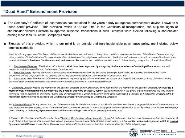 41 Strictly Confidential. Do Not Duplicate or Distribute. Ŷ The Company’s Certificate of Incorporation has contained for 22 years a truly outrageous entrenchment device, known as a “dead hand” provision . This provision, which is “Article Fifth” in the Certificate of Incorporation, can strip the rights of shareholder - elected Directors to approve business transactions if such Directors were elected following a shareholder owning more than 5 % of the Company’s stock Ŷ Excerpts of this provision, which to our mind is an archaic and truly indefensible governance policy, are included below (emphasis added) : In addition to any approval of the Board of Directors or stockholders, and satisfaction of any other conditions, required by the la ws of the State of Delaware or any other provision of this Certificate of Incorporation in effect at the time of the adoption or authorization of a Business Com bin ation, it shall be required for the adoption or authorization of a Business Combination with an Interested Person that the conditions set forth in each of the following paragraphs 1, 2 and 3 be fulfilled : 1 . Disinterested Directors . The Business Combination shall have been approved by a majority of directors who are Continuing Directors and are, with respect to such Interested Person, Disinterested Directors; and 2 . Proxy Statement . A proxy statement in accordance with the requirements of the Securities Exchange Act of 1934, as amended shall be mailed to th e stockholders of the Corporation for the purpose of soliciting stockholder approval of the Business Combination; and 3 . Stockholder Vote . The Business Combination shall be approved by the affirmative vote of the holders of at least 66 2/3 percent of those of th e o utstanding shares of stock generally entitled to vote which are not beneficially owned by such Interested Person . A " Continuing Director " means any member of the Board of Directors of the Corporation, while such person is a member of the Board of Directors, who wa s (a) a member of (or nominated to be a member of) the Board of Directors on April 1, 1993 or (b) was a member of the Board of Directors prior to the time that the Interested Person became an Interested Person, and any successor of a Continuing Director while such successor is a member of th e Board of Directors, who is recommended or elected to succeed the Continuing Director by a majority of Continuing Directors . An " Interested Person " is any person who, as of the record date for the determination of stockholders entitled to notice of a proposed Business Combination and to vote thereon or consent thereto, or as of the date of any such vote or consent, or immediately prior to the consummation of the Business Combination, beneficially owns, directly or indirectly, 5 percent or more of the outstanding shares of stock generally entitled to vote . A Business Combination shall be deemed to be a " Business Combination with an Interested Person " if, in the case of a Business Combination described in clause (i) or (ii) of this subparagraph, it is a transaction with an Interested Person or any of its affiliates or associates or a transaction with another person which is caused by an Interested Person or any of its affiliates or associates or if it is a transaction described in clause (iii) or (iv) of this subparagraph . “Dead Hand” Entrenchment Provision