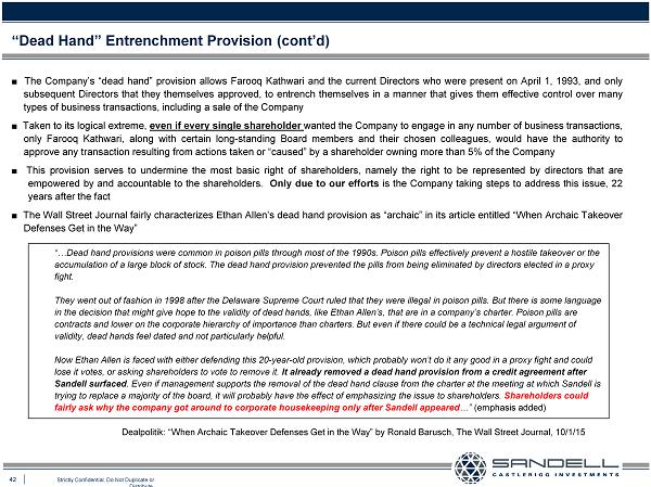 42 Strictly Confidential. Do Not Duplicate or Distribute. Ŷ The Company’s “dead hand” provision allows Farooq Kathwari and the current Directors who were present on April 1 , 1993 , and only subsequent Directors that they themselves approved, to entrench themselves in a manner that gives them effective control over many types of business transactions, including a sale of the Company Ŷ Taken to its logical extreme, even if every single shareholder wanted the Company to engage in any number of business transactions, only Farooq Kathwari, along with certain long - standing Board members and their chosen colleagues, would have the authority to approve any transaction resulting from actions taken or “caused” by a shareholder owning more than 5 % of the Company Ŷ This provision serves to undermine the most basic right of shareholders, namely the right to be represented by directors that are empowered by and accountable to the shareholders . Only due to our efforts is the Company taking steps to address this issue, 22 years after the fact Ŷ The Wall Street Journal fairly characterizes Ethan Allen’s dead hand provision as “archaic” in its article entitled “When Archaic Takeover Defenses Get in the Way” “Dead Hand” Entrenchment Provision (cont’d) “…Dead hand provisions were common in poison pills through most of the 1990s. Poison pills effectively prevent a hostile take ove r or the accumulation of a large block of stock. The dead hand provision prevented the pills from being eliminated by directors electe d i n a proxy fight. They went out of fashion in 1998 after the Delaware Supreme Court ruled that they were illegal in poison pills. But there is som e language in the decision that might give hope to the validity of dead hands, like Ethan Allen’s, that are in a company’s charter. Pois on pills are contracts and lower on the corporate hierarchy of importance than charters. But even if there could be a technical legal argu men t of validity, dead hands feel dated and not particularly helpful. Now Ethan Allen is faced with either defending this 20 - year - old provision, which probably won’t do it any good in a proxy fight and could lose it votes, or asking shareholders to vote to remove it. It already removed a dead hand provision from a credit agreement after Sandell surfaced . Even if management supports the removal of the dead hand clause from the charter at the meeting at which Sandell is trying to replace a majority of the board, it will probably have the effect of emphasizing the issue to shareholders. Shareholders could fairly ask why the company got around to corporate housekeeping only after Sandell appeared …” (emphasis added) Dealpolitik: “When Archaic Takeover Defenses Get in the Way” by Ronald Barusch , The Wall Street Journal, 10/1/15