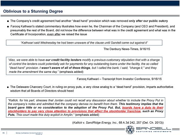 43 Strictly Confidential. Do Not Duplicate or Distribute. Ŷ The Company’s credit agreement had another “dead hand” provision which was removed only after our public outcry Ŷ Farooq Kathwari’s stated commentary illustrates how even he, the Chairman of the Company (and CEO and President), and presumably the rest of the Board, did not know the difference between what was in the credit agreement and what was in the Certificate of Incorporation, even after we raised the issue Oblivious to a Stunning Degree “Kathwari said Wednesday he had been unaware of the clause until Sandell came out against it” The Danbury News - Times, 9/16/15 “Also , we were able to have our credit facility lenders modify a previous customary stipulation that with a change of control the lenders could potentially ask for payments for any outstanding loans under the facility, the so called "dead hand” provision. I wasn’t aware of all of these things , but I called the bank; I said, "change it," and they made the amendment the same day.” (emphasis added) Farooq Kathwari – Transcript from Investor Conference, 9/16/15 Ŷ The Delaware Chancery Court, in ruling on proxy puts, a very close analog to a “dead hand” provision, imparts authoritative wisdom that all Boards of Directors should heed " Kallick, for his part, stresses that Jordan could not recall any discussion about whether to include the Proxy Put in the company’s notes and admitted that the company derives no benefit from them . This testimony implies that the board gave little or no consideration to the adoption of the Proxy Put . But, boards have a duty to their stockholders to pay very close attention to provisions that affect the stockholder franchise , such as Proxy Puts . This court made this duty explicit in Amylin . “ (emphasis added) ( Kallick v. SandRidge Energy, Inc ., 68 A.3d 242, 257 (Del. Ch. 2013))