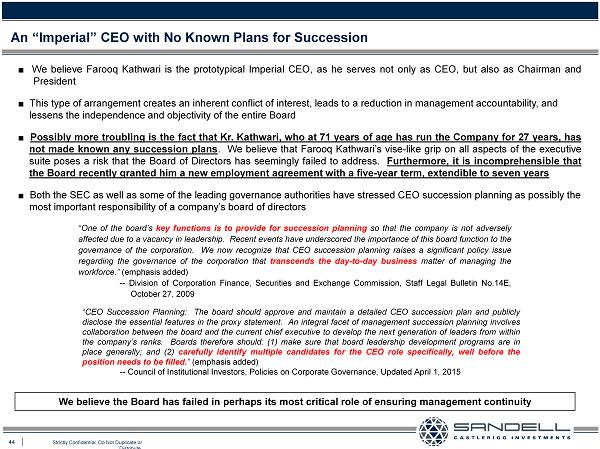 44 Strictly Confidential. Do Not Duplicate or Distribute. Ŷ We believe Farooq Kathwari is the prototypical Imperial CEO, as he serves not only as CEO, but also as Chairman and President Ŷ This type of arrangement creates an inherent conflict of interest, leads to a reduction in management accountability, and lessens the independence and objectivity of the entire Board Ŷ Possibly more troubling is the fact that Kr . Kathwari, who at 71 years of age has run the Company for 27 years, has not made known any succession plans . We believe that Farooq Kathwari’s vise - like grip on all aspects of the executive suite poses a risk that the Board of Directors has seemingly failed to address . Furthermore, it is incomprehensible that the Board recently granted him a new employment agreement with a five - year term, extendible to seven years Ŷ Both the SEC as well as some of the leading governance authorities have stressed CEO succession planning as possibly the most important responsibility of a company’s board of directors An “Imperial” CEO with No Known Plans for Succession We believe the Board has failed in perhaps its most critical role of ensuring management continuity “ One of the board’s key functions is to provide for succession planning so that the company is not adversely affected due to a vacancy in leadership . Recent events have underscored the importance of this board function to the governance of the corporation . We now recognize that CEO succession planning raises a significant policy issue regarding the governance of the corporation that transcends the day - to - day business matter of managing the workforce . ” (emphasis added) -- Division of Corporation Finance, Securities and Exchange Commission, Staff Legal Bulletin No . 14 E, October 27 , 2009 “CEO Succession Planning : The board should approve and maintain a detailed CEO succession plan and publicly disclose the essential features in the proxy statement . An integral facet of management succession planning involves collaboration between the board and the current chief executive to develop the next generation of leaders from within the company’s ranks . Boards therefore should : ( 1 ) make sure that board leadership development programs are in place generally ; and ( 2 ) carefully identify multiple candidates for the CEO role specifically, well before the position needs to be filled . ” (emphasis added) -- Council of Institutional Investors, Policies on Corporate Governance, Updated April 1, 2015