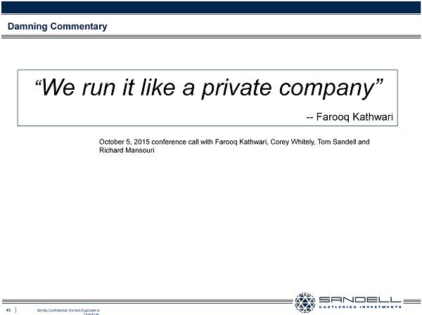45 Strictly Confidential. Do Not Duplicate or Distribute. “ We run it like a private company” -- Farooq Kathwari Damning Commentary October 5, 2015 conference call with Farooq Kathwari, Corey Whitely, Tom Sandell and Richard Mansouri